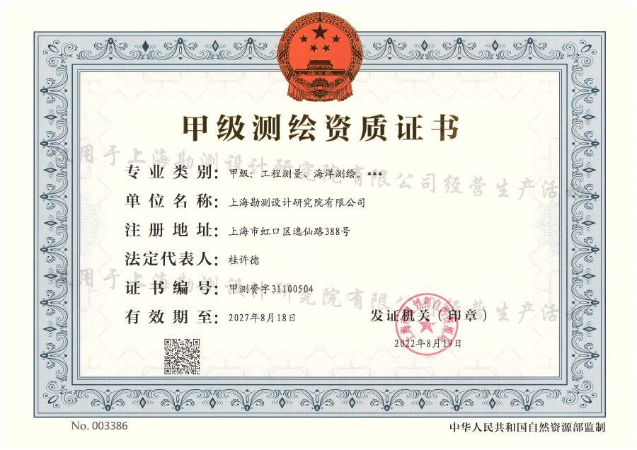 測繪甲級資質(zhì)證書:工程測量甲級、海洋測繪甲級