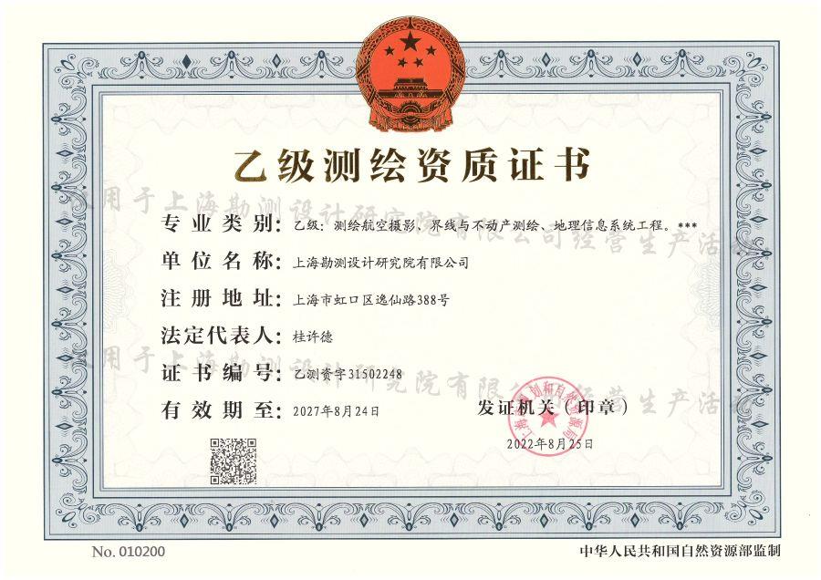 測繪乙級資質(zhì)證書:測繪航空攝影乙級、地理信息系統(tǒng)工程乙級、界限與不動產(chǎn)測繪乙級