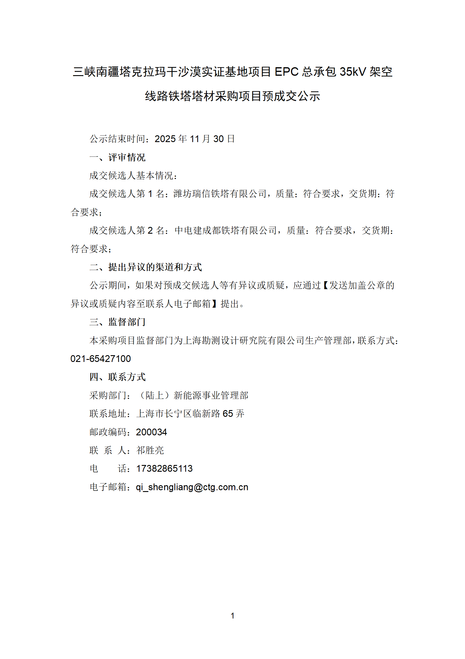 三峽南疆塔克拉瑪干沙漠實證基地項目EPC總承包35kV架空線路鐵塔塔材采購項目預(yù)成交公示